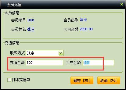 保存以后会员充值时,充值100元折兑金额自动变为120元