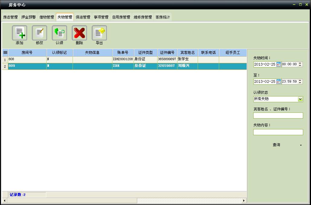 5、失物管理:可对失物进行登记和认领。