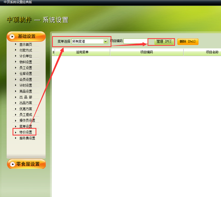 1.首先登陆中顶零食屋后台系统设置,基础设置→特价设置,选择对应菜单,点管理按钮