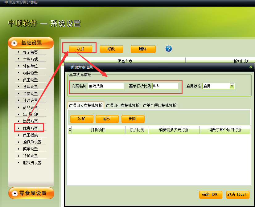 1.打开系统设置,点击 ” 优惠方案”,添加优惠方案