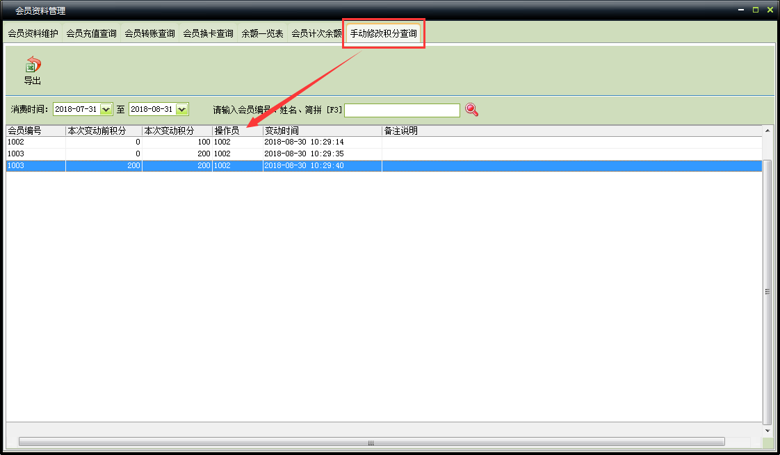 手动增加、减少积分可以在‘手动修改积分查询’里查询出相关操作信息