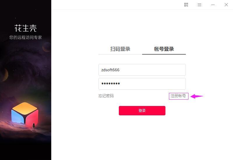 2.花生壳客户端安装成功后打开,在登陆界面注册账号成功后,登陆