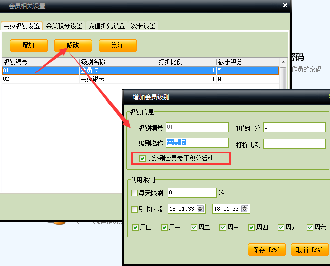 2.点击会员级别设置勾选‘此级别会员参与积分活动’。