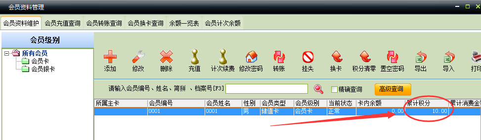 4.会员消费48元,结账后在会员资料查看会员积分,如图