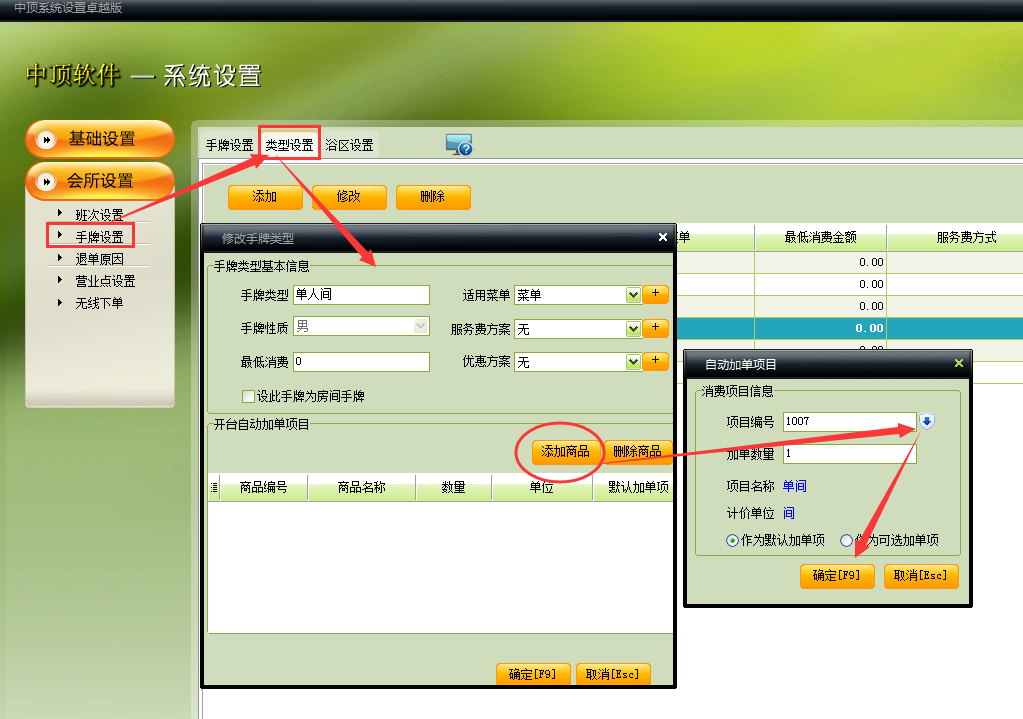 1.首先,登陆中顶会所软件后台系统设置,会所设置→手牌设置→类型设置,在自动加单项目中点‘添加商品’按钮,把浴资项目添加到自动加单项目中