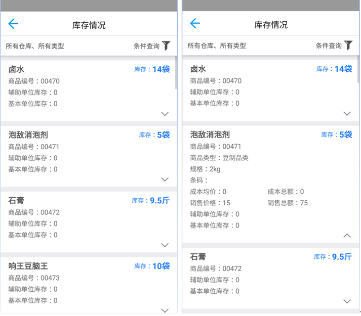 点击一条商品信息又下角箭头à展开详细信息à点击该商品信息à查询该商品详细信息