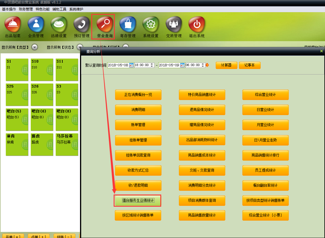 3.房台消费结账以后,打开营业查询→值台服务生业绩统计报表