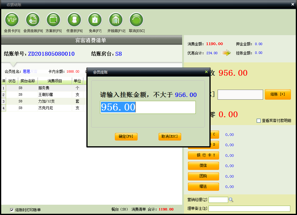 2.弹出会员挂账小窗口,确定后点【结账】按钮完成
