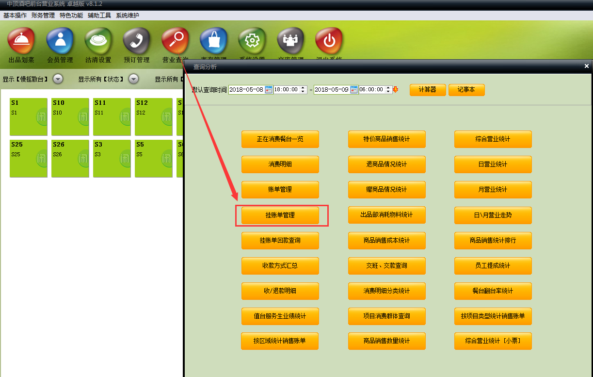 1.中顶酒吧软件前台营业主界面,营业查询→挂账单管理