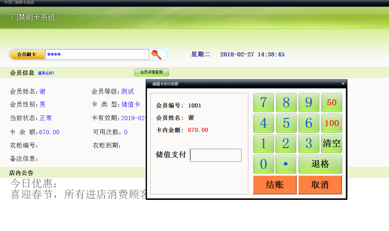 4.储值支付栏填上扣除金额,点【结账】,门禁模块右下角弹出提示“储值支付:50元,支付成功!”