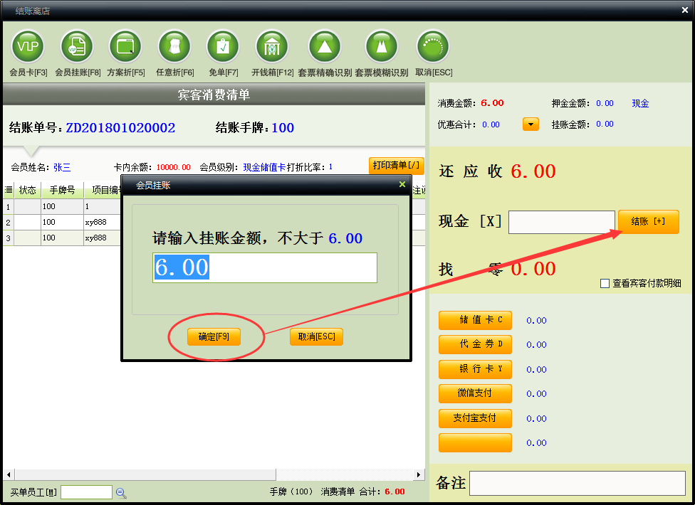 弹出会员挂账小窗口,确定后点【结账】按钮完成.