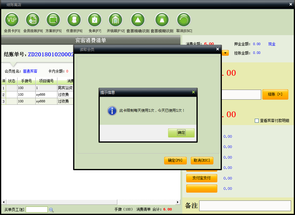 2.设置完会员级别限制刷卡次数之后,回到中顶洗浴软件前台营业,先结账刷一次会员卡,然后再进行第二次刷卡结账时就会出现提示【此卡限制每天使用去1次,今天已使用1次!】,而不能再继续刷卡结账了