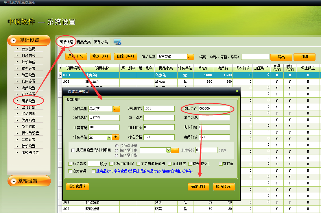 1.登陆中顶茶楼软件后台系统设置,基础设置→商品设置→商品信息,对要打印条码标签的商品【项目条码】项中填上条码信息,确定.