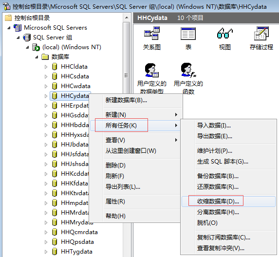 2.继续对数据库名字右键,所有任务→收缩数据库