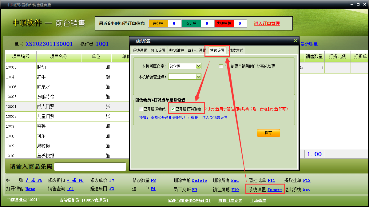 4.登陆中顶游乐园软件前台营业,系统设置→其它设置,勾选“已开通扫码购票”项,并保存(保存成功后重新登陆游乐园软件前台营业).