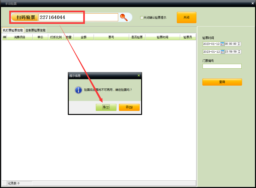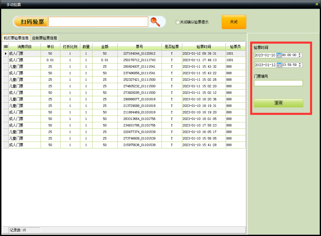 也可以在此窗口中查询已验票成功的门票信息