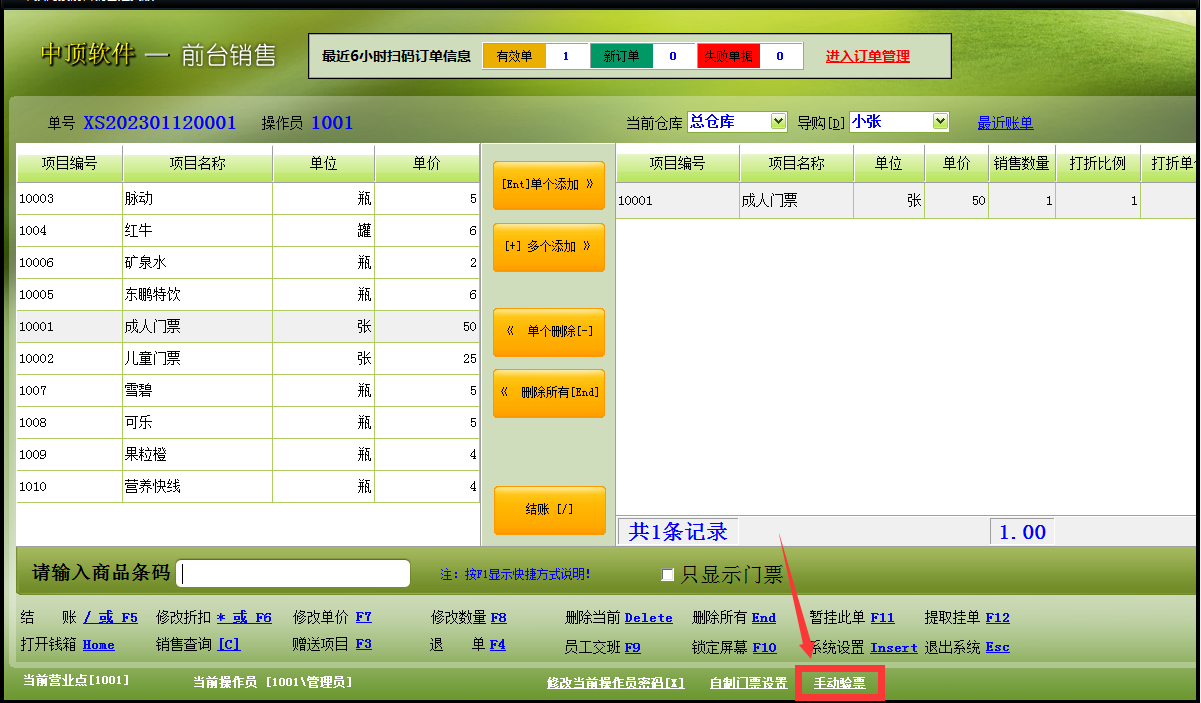 1.登陆游泳馆软件前台营业,点【手动验票】按钮