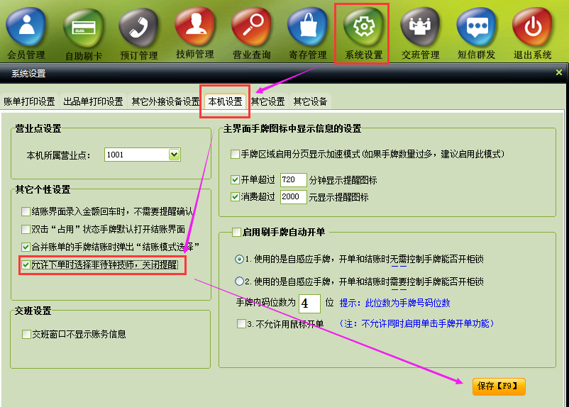 1.在中顶洗浴软件前台营业,系统设置→本机设置,勾选【允许下单时选择非待钟技师,关闭提醒】,并保存.