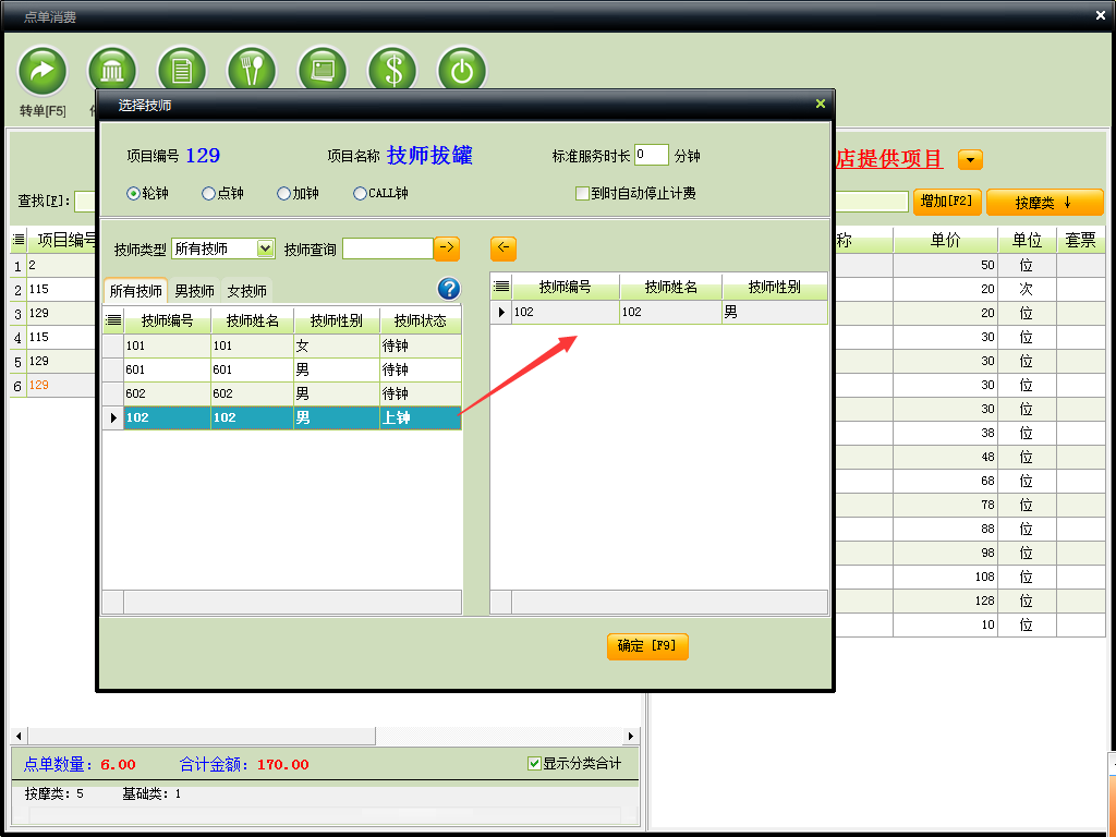 2.再回到洗浴软件前台营业,点单选择已上钟(或派工)技师时,可以直接选择,不会再有提示