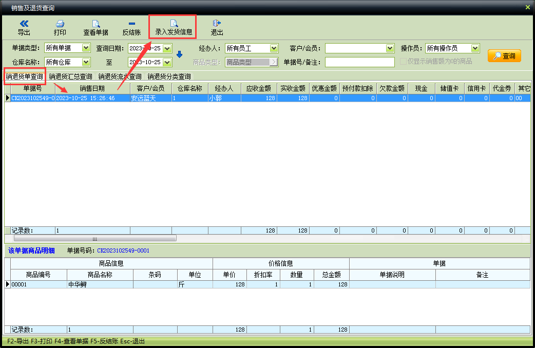 2.在销售查询中,查找到要录发货信息的单据,点【录入发货信息】按钮,