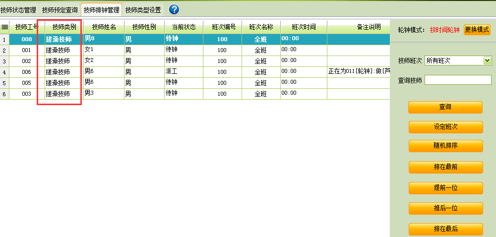 3.这样设置完成后,在技师状态管理,技师排钟管理等信息中就看不到普通员工信息了
