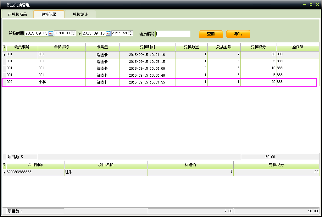 4.选择积分兑换商品,点积分兑换,操作如下图,输入会员编号002,确定;