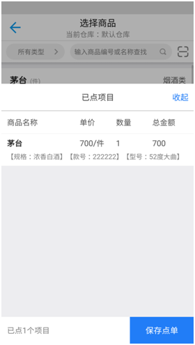 下单到已点项目,在弹出的已点项目窗口选择“保存点单”返回到商品销售窗口。商品销售单中的商品信息就已添加完成。